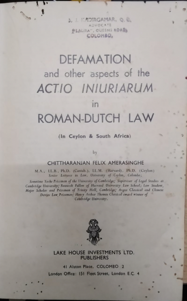 Defamation and other aspects of the Actio Iniuriarum in Roman-Dutch Law In Ceylon and South Africa